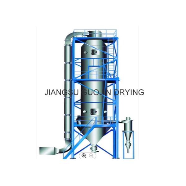 The liquid or paste raw material is sprayed into small liquid drop by pressed sprayer draw assistance from pressure of diaphram pump, and quickly drying through amply heat exchange (10-90sec.).Most of the powder granules are collected from outlet of discharge at the bottom of the dryer. The wasted air and fine powder are separated by the cyclone, the wasted air is exhaust from draft fan, and fine powder is collected at the bottom of cyclone. There is a second grade duster equipped at the outlet; therefore, the recovery rate of the finished powder granule can be 96% to 98%.